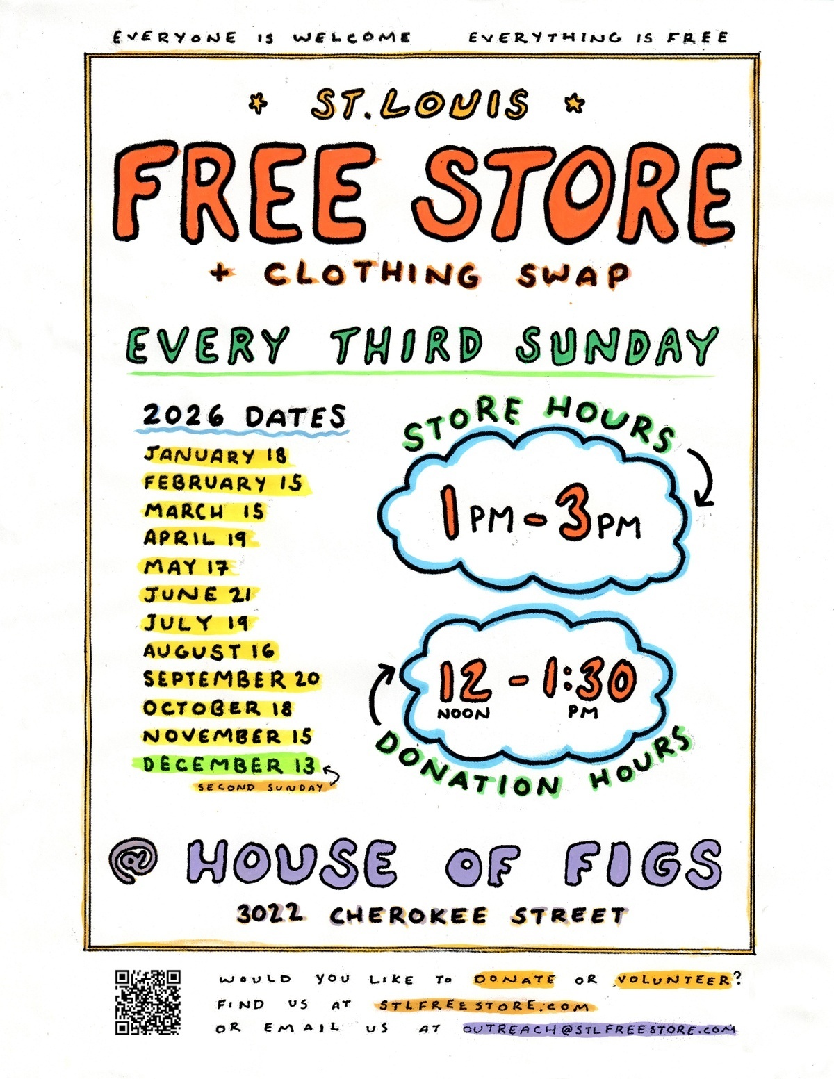 Donations accepted 12PM - 1:30PM, store is open 1PM to 3PM.